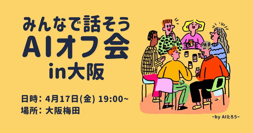 | 内容 | 去年に1度だけ開催した大阪オフ会。 その後「また大阪でも開催してほしい」という声をたくさんいただいていて、 今年4月に、改めて開催します! AIのこと、日常のこと、作っている作品のことなど、ワイワイお話できたらと思います! |